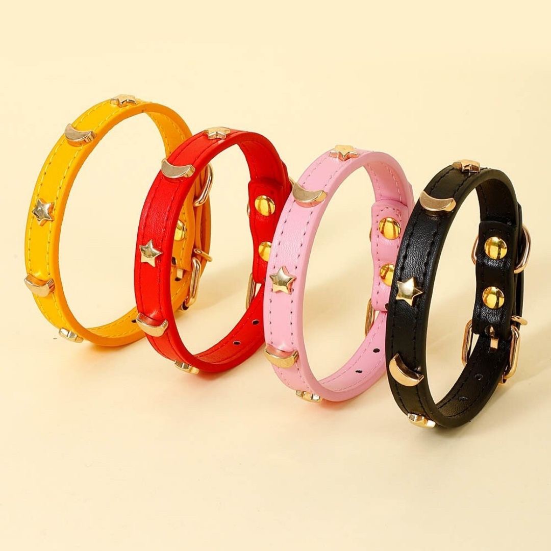 月と星のデザインがとてもかわいい猫用ペット首輪です。高品質な革素材で作られたベルト式で着脱も簡単。